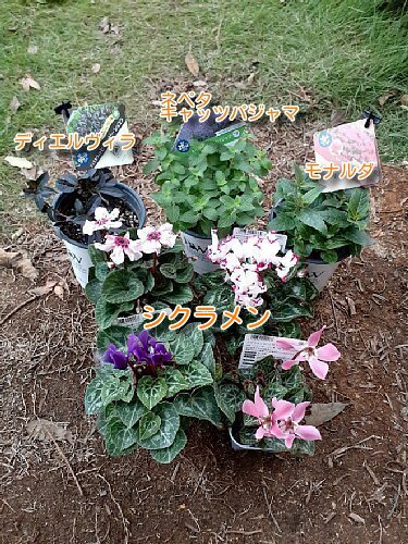 そうそう、シクラメン以外の花苗、ディエルヴィラ、ネペタ キャッツパジャマ、モナルダも半地植えにするので、とりあえず鉢に植えておきました👇