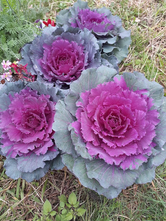 この光景が忘れられなくて、今回、少し大きな葉ボタンをホームセンターで見かけたので、5株お迎えして同じように植えてみた・・・というわけです(笑)